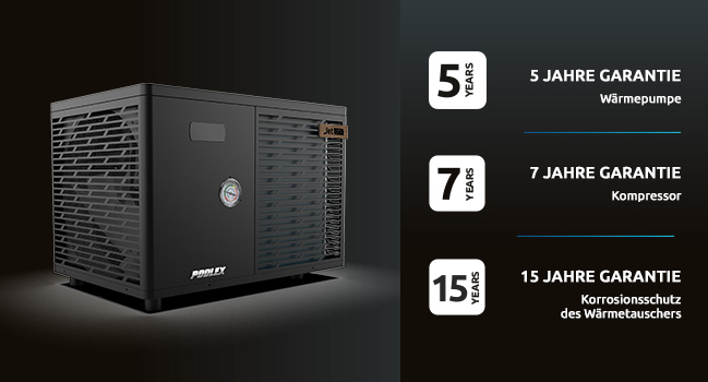Dank ihrer hochwertigen Fertigung bietet die JET CITY Wärmepumpe eine lange Garantie: 5 Jahre für alle Komponenten, 7 Jahre für den Kompressor und 15 Jahre für den Titan-Wärmetauscher. Diese außergewöhnliche Abdeckung sorgt für optimale Ruhe für die Benutzer.