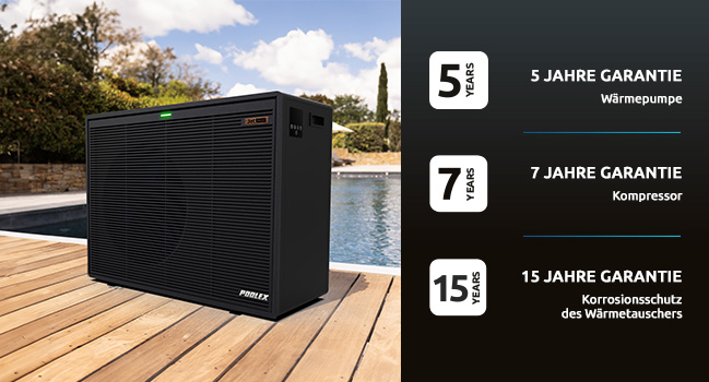 Dank ihrer hochwertigen Produktion bietet die JET MAX Wärmepumpe auch eine außergewöhnliche 5-Jahres-Garantie auf alle Teile, davon 7 Jahre auf den Kompressor und 15 Jahre auf die Titan-Spirale, was zusätzlichen Seelenfrieden bietet.