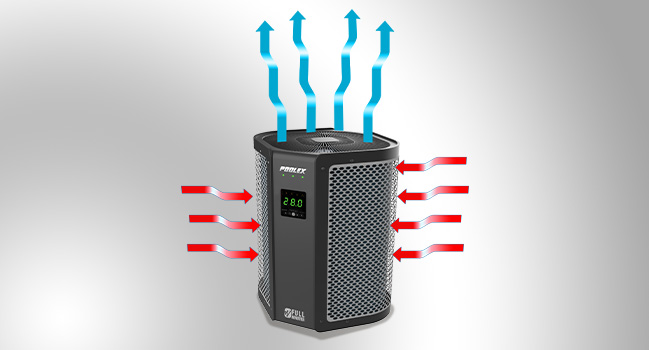 Trotz ihrer Leistung, die für große Volumen geeignet ist, verbraucht diese Pool-Wärmepumpe sehr wenig Platz. Auch im Auslassbereich, da die Luft nach oben geblasen wird.