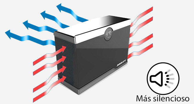 Pero la Silent Max es aún más silenciosa que cualquier otra bomba de calor para piscinas del mercado. Su ventilación es impulsada hacia la parte trasera del equipo.