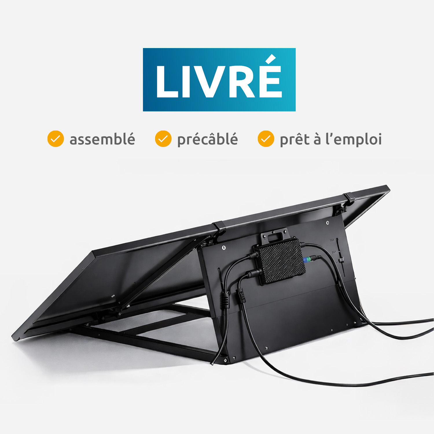 Structure, panneaux et micro-onduleur déjà assemblés. Posez au sol, branchez sur prise standard et c'est parti.