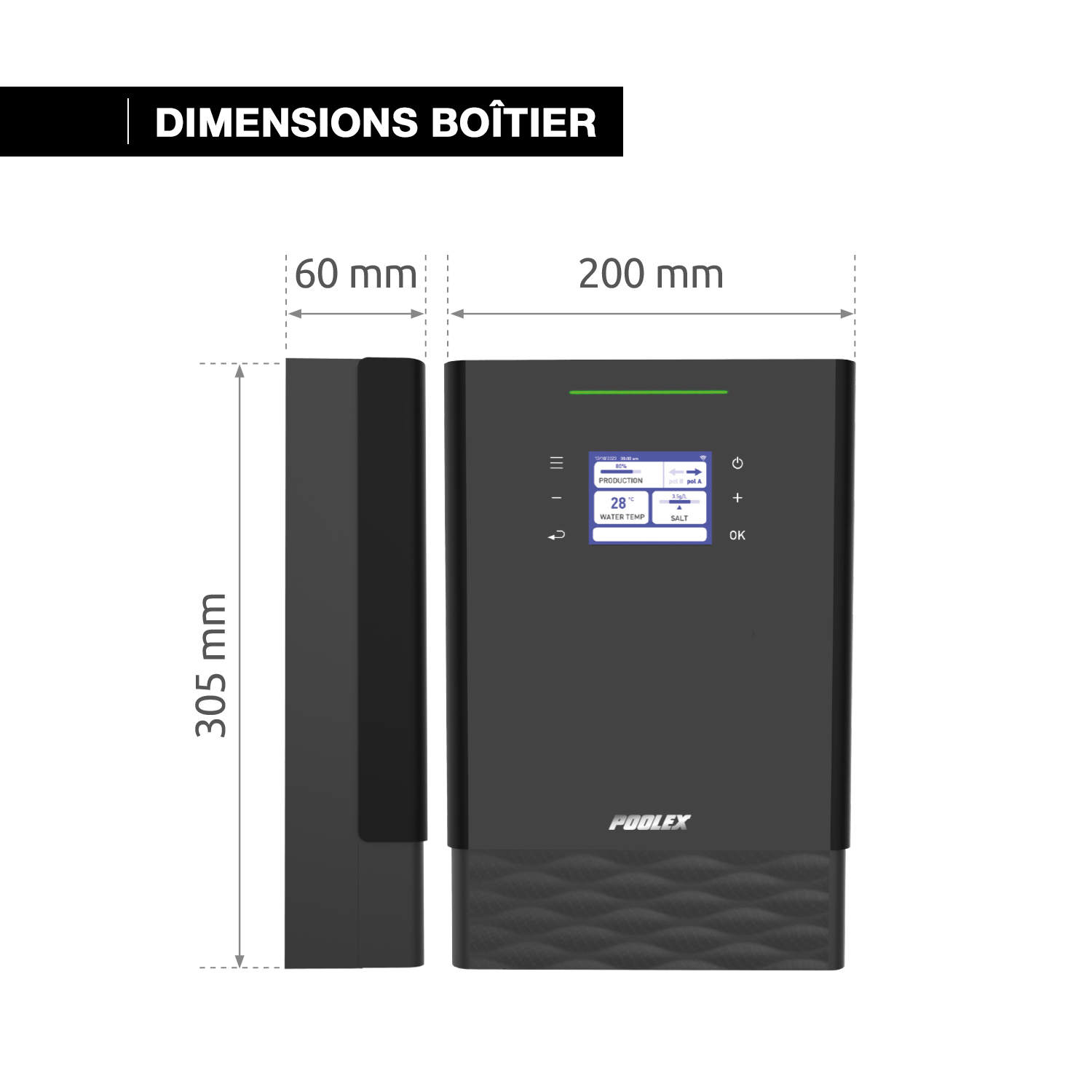 | Fonctionnalités | Pilotage de la pompe de circulation (contact sec). Adaptation de la production en fonction du volet (contact sec). Interface multilingue. Compatible avec kit sonde ORP en option. |