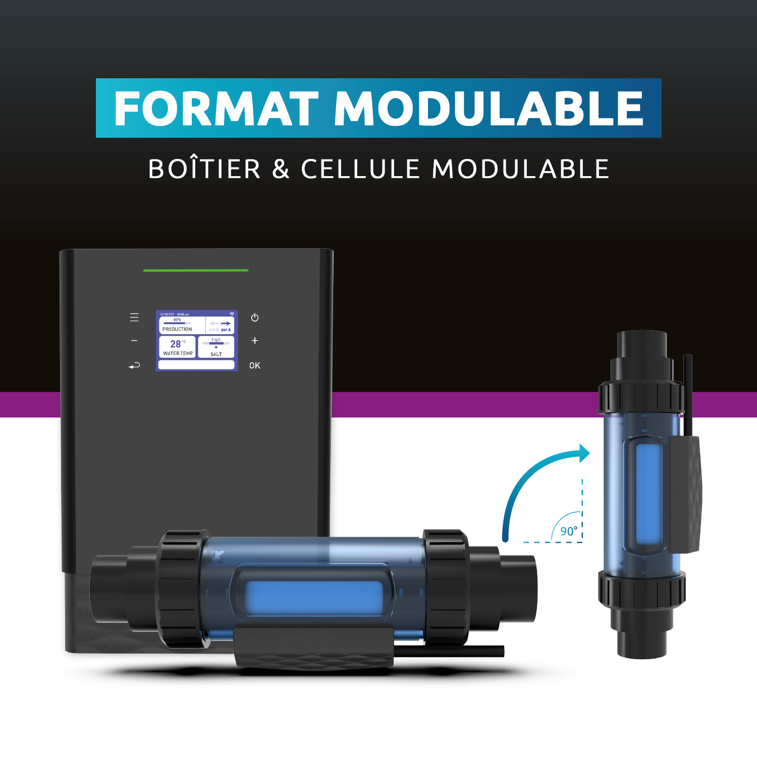 Le Modulyser de Poolex est un électrolyseur au sel modulaire nouvelle génération, conçu pour les installations résidentielles exigeantes. Grâce à sa cellule déportée et son format en deux éléments distincts, il s’adapte facilement aux locaux techniques complexes tout en offrant une excellente accessibilité pour l’entretien.
